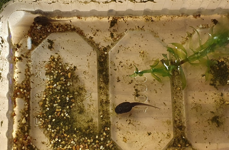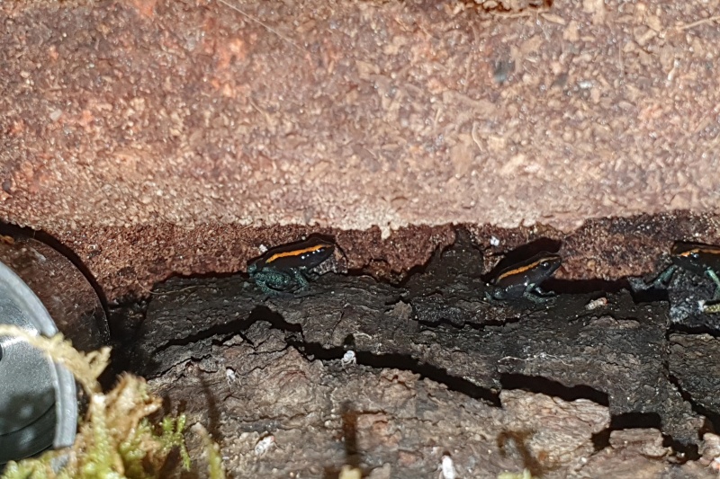Bereits zum zweiten Mal gibt es Nachwuchs bei unseren Gestreiften Blattsteigern (Phyllobates vittatus). In diesem Schuljahr konnten wir sechs Kaulquappen im Wasserteil unseres Terrariums entdecken, die dann zur besseren Kontrolle in einem separaten Becken aufgezogen wurden. Mittlerweile haben sie die Metamorphose durchgemacht und sich zu winzigen Jungfröschen entwickelt.