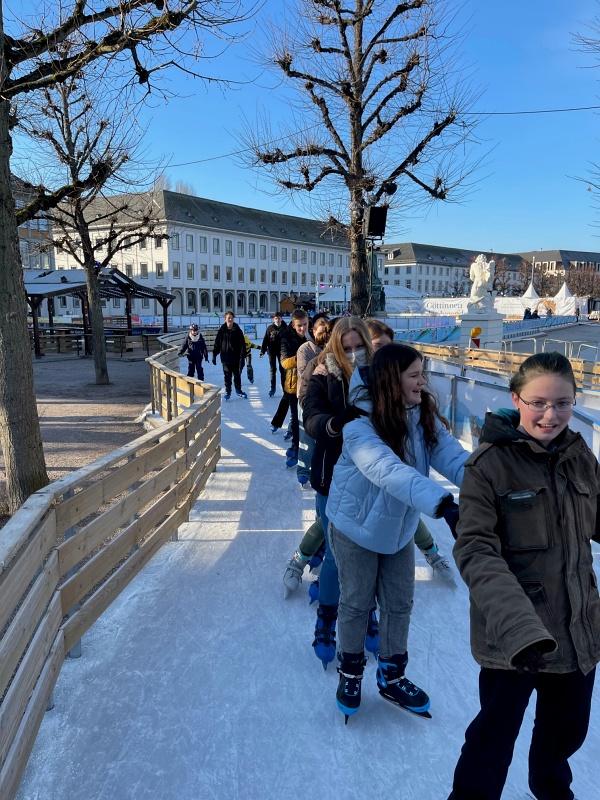Unsere 25 Schüler*Innen der 8b der Lothar von Kübel Realschule waren mit ihrem Klassenlehrer Herr Kuhn an einem wunderschönen und sonnigen Mittwoch im Januar auf der Outdoor-Eislauffläche in Karlsruhe. Die Eislauffläche vor dem Karlsruher Schloss war für unsere Schüler*Innen beeindruckend. Die Klasse konnte es kaum erwarten, die ausgeliehenen Schlittschuhe anzuziehen und Kreise auf dem Eis zu ziehen. Intuitiv konnten alle Schüler*innen auf dem Eis laufen; sie fassten sich an den Schultern oder an den Händen und zogen gemeinsam über das Eis. Eineinhalb Stunden vergingen dabei wie im Flug. Im Anschluss besichtigte die Klasse noch die neue Karlsruher U-Bahn und natürlich nutzten sie die Gelegenheit, um noch etwas durch die Innenstadt zu schlendern. Es war ein sehr schöner Tag, der auch den Zusammenhalt der Gruppe gestärkt hat.