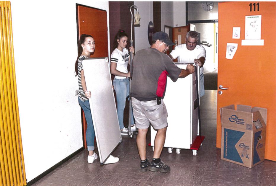 Am 12.07.2017 fand der große Umzug aus dem Altbau in den neu errichteten Nordflügel statt. 30 Lehrerinnen und Lehrer, 72 Neuntklässler unsere Sekretärin Frau Walter mit unserer FSJ-Leistenden Caroline Lorenz und unser Hausmeister Herr Eugen Kohler, verstärkt durch sechs Bauhofmitarbeiter, machten sich ans Werk. Bereits im Vorfeld wurden unzählige Kartons gepackt (ca. 400 Stück), Schränke geleert und viele Pläne erstellt. Am Morgen trafen sich die Erwachsenen bereits eine Stunde früher, um die anstehenden Arbeiten zu koordinieren. Mit Hilfe der etwas später eintreffenden Schüler, zogen nun vor allem die Bereiche Verwaltung, die Naturwissenschaften, Textiles Werken, die Sanitäter und der Lehrmittelbereich um. Unterstützt durch zahlreiche Rollwägen und der unermüdlichen Schar von Helfern bewältigten wir gemeinsam das große Vorhaben.